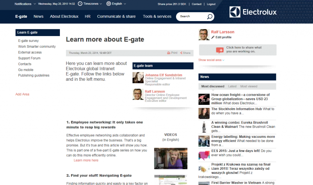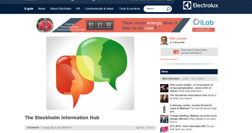 What I found interesting about E-gate was the way its branded corporate news has been embedded with social and commenting functionalities. The deep integration between information and collaboration has created a strong interest among employees in interacting with content that otherwise could be easily neglected. In fact, social is leveraging Electrolux’s reach – staff actively interact with, share and comment on stories.