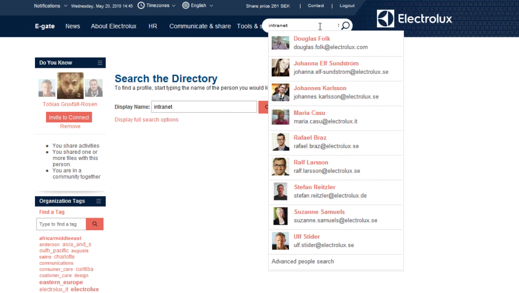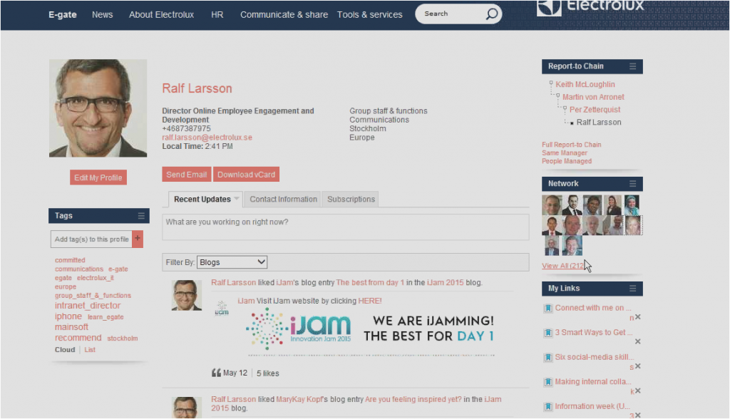 Larsson stressed the importance of people profiles and directory, which have become key to easily find, connect and interact with co-workers despite business functions and locations. On E-gate people can download the e-cards of their colleagues as well as access their full Report-to-Chain, which means seeing the people that manage them or are managed by them.