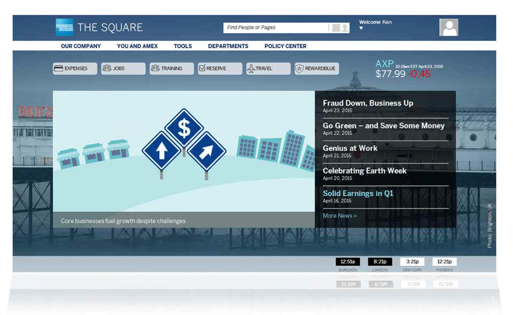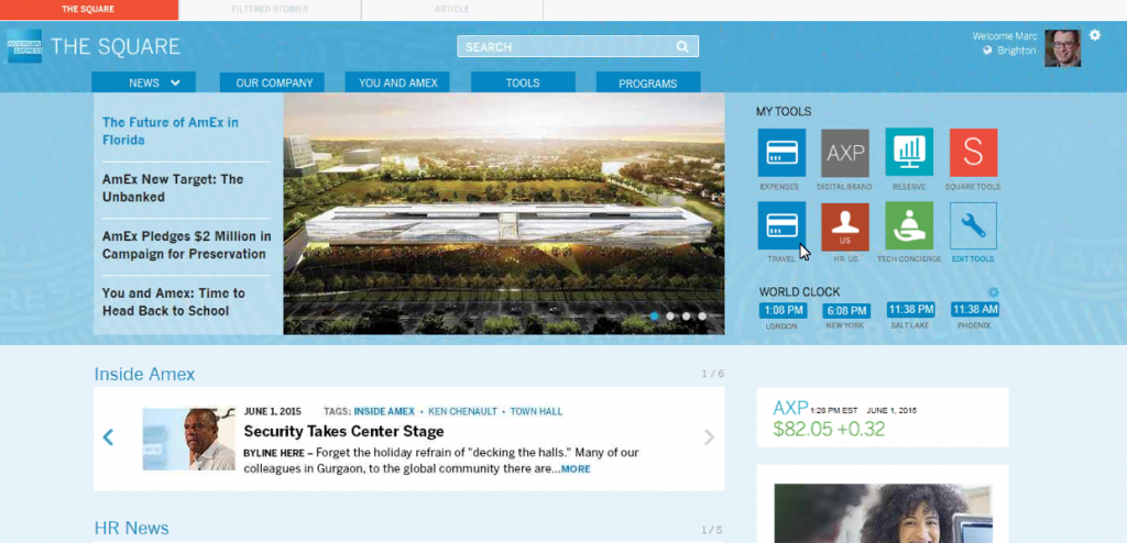 The Square is American Express’ internal platform based on SharePoint 2013 and accessed by 60,000 employees and contractors on a daily basis. The solution is currently on premise but future plans include going to the hybrid cloud, according to Director of Online Content and Platforms Ashley Lucio.