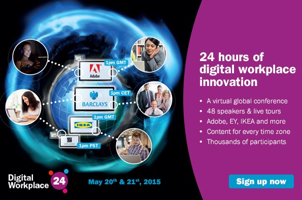 But, the Digital Workplace Group (DWG) has found a nice way to help with this challenge. This week they have produced a virtual global conference called Digital Workplace 24 (#DW24). The live event ran for 24 hours in a row with over forty speakers sharing best practice and thinking across the world. It covered hot topics and organising principles including cultural change, collaboration, internal communications, mobile apps, user experience design, strategy, governance, gamification and the future of work.