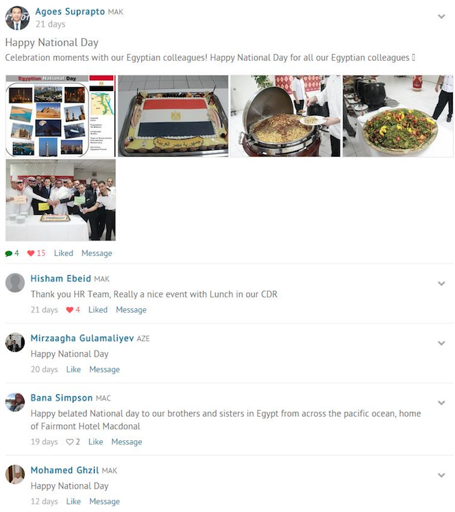 In terms of the type of content, Paraschiv recalls how at the beginning there used to be many more differences as people were not sure about what to post. “In North America, PR and Marketing would take the lead sharing stories about their hotels (e.g. the opening of a new restaurant, or some volunteering work in the community); in Asia, HR was more visible (e.g. celebrating colleagues’ birthday with pictures of beautiful cakes); in the Middle East staff would constantly share pictures of their hotels.”