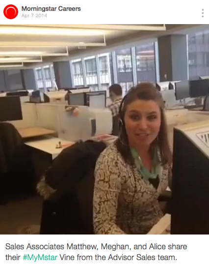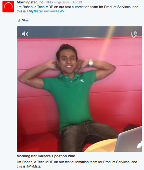 Vine also worked well for the campaign because it complements Twitter. It was a good way to promote our @Morningstarjobs account.